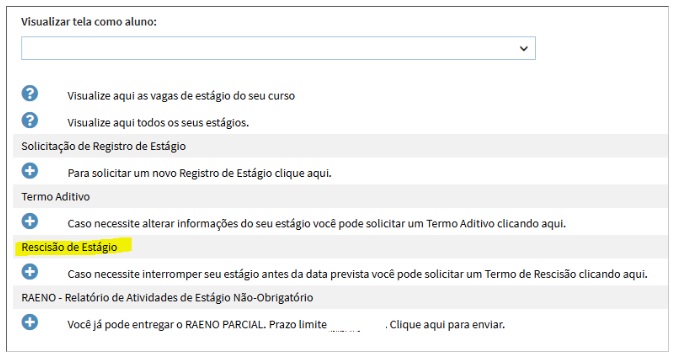 Quando o estágio precisar ser interrompido antes do prazo previsto no Termo de Compromisso de Estágio – TCE, seja por motivos da empresa (concedente) ou do aluno (estagiário) deve ser feito o Termo de Rescisão para oficializar o término. O pedido deste termo é pelo sistema SIARE e após aprovado pelo Prof. Coordenador de Estágios estará disponível para download.